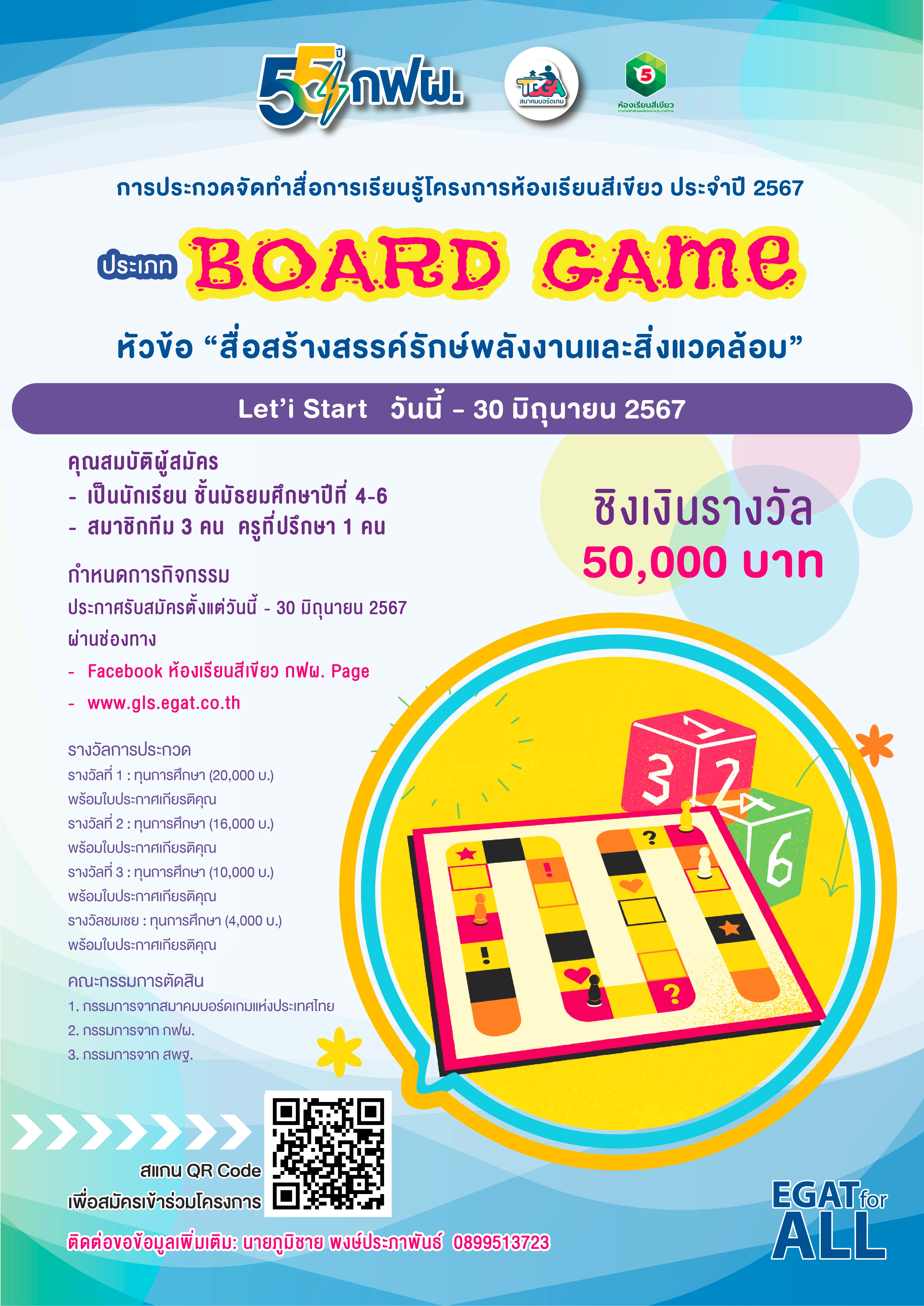 **** ผู้สนใจร่วมกิจกรรม และ ผู้ส่งผลงานเข้าร่วมประกวด สามารถเข้าร่วม “บรรยายเทคนิคการจัดทำ Board Game” โดยวิทยากรจากสมาคมบอร์ดเกมประเทศไทยใน วันที่ 9 พฤษภาคม 2567 เวลา 9.00 - 16.00 น. รูปแบบ Online ที่โปรแกรม Microsoft team โดยสามารถรับชมได้ที่ QR Code และสามารถรับชมวีดีโอย้อนหลังได้ที่ https://gls.egat.co.th , YouTube : กฟผ. โครงการห้องเรียนสีเขียว Green Learning Room