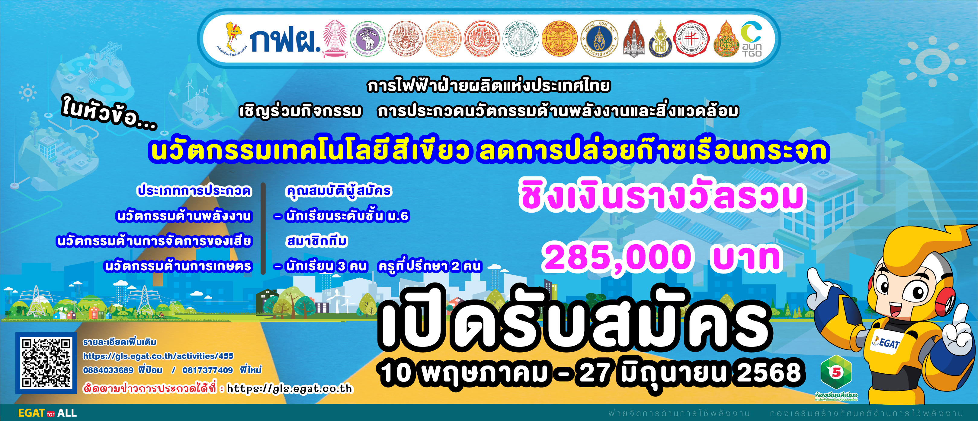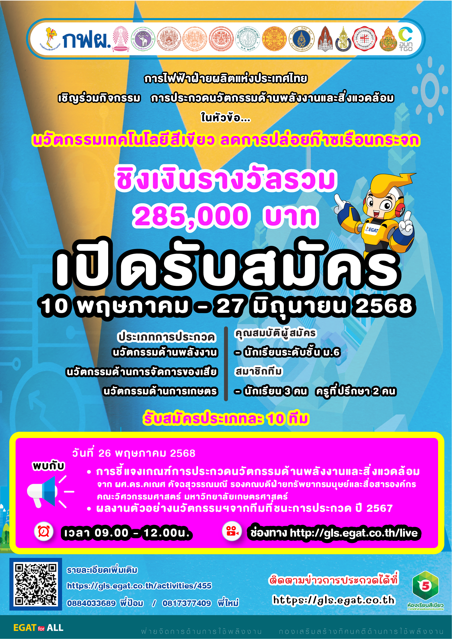 ประกาศทีมที่ผ่านรอบคัดเลือกรอบแรก วันที่ 26 กรกฎาคม 2568 ผ่าน Website : https://gls.egat.co.th/activities