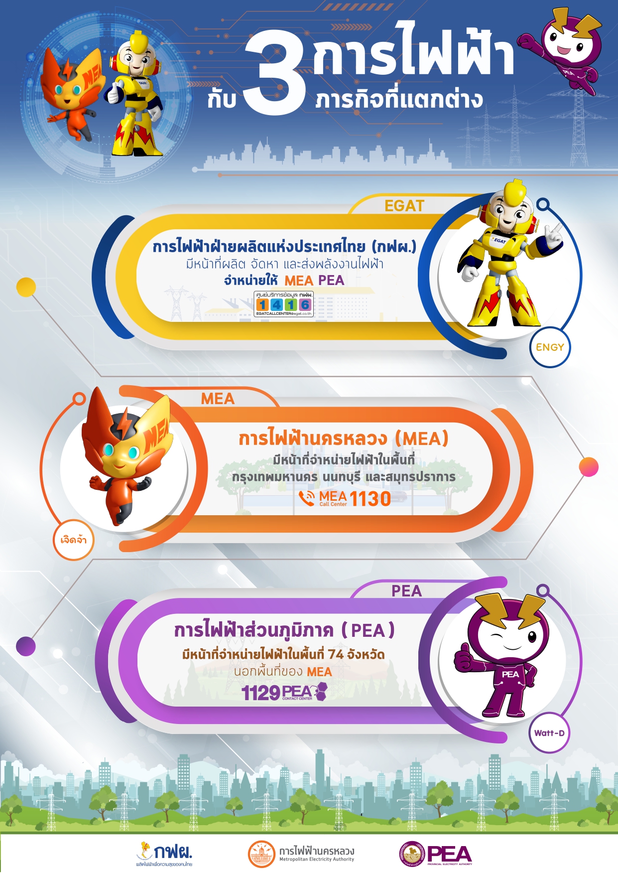 3 การไฟฟ้า “กฟผ. MEA และ PEA” นอกจากจะมีภารกิจหน้าที่ที่แตกต่างกันแล้ว แต่ละการไฟฟ้ายังมีมาสคอตและสีประจำองค์การที่แตกต่างกันอีกด้วย มาทำความรู้จักกับมาสคอตและสีประจำองค์การของทั้ง 3 การไฟฟ้ากัน ……